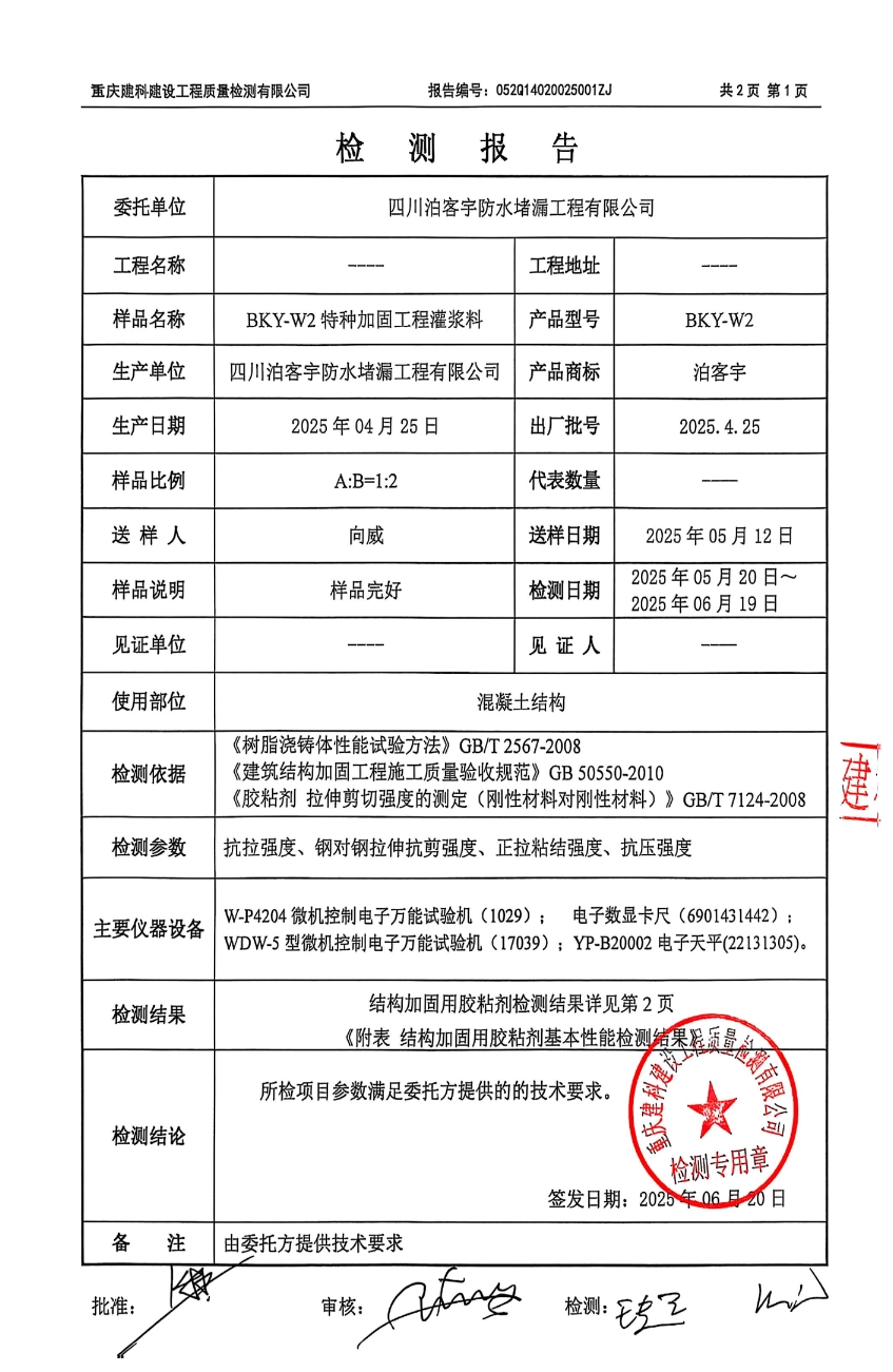 性能:流动性好,可有效渗透至微裂隙,抗压强度高,韧性好,能够弥补结构施工缺陷带来的混泥土强度;水中固化,遇水固化,粘接性好,可避免裂缝沉降带来的第二次开裂;环保性好,无污染,可用于饮用水结构修复。