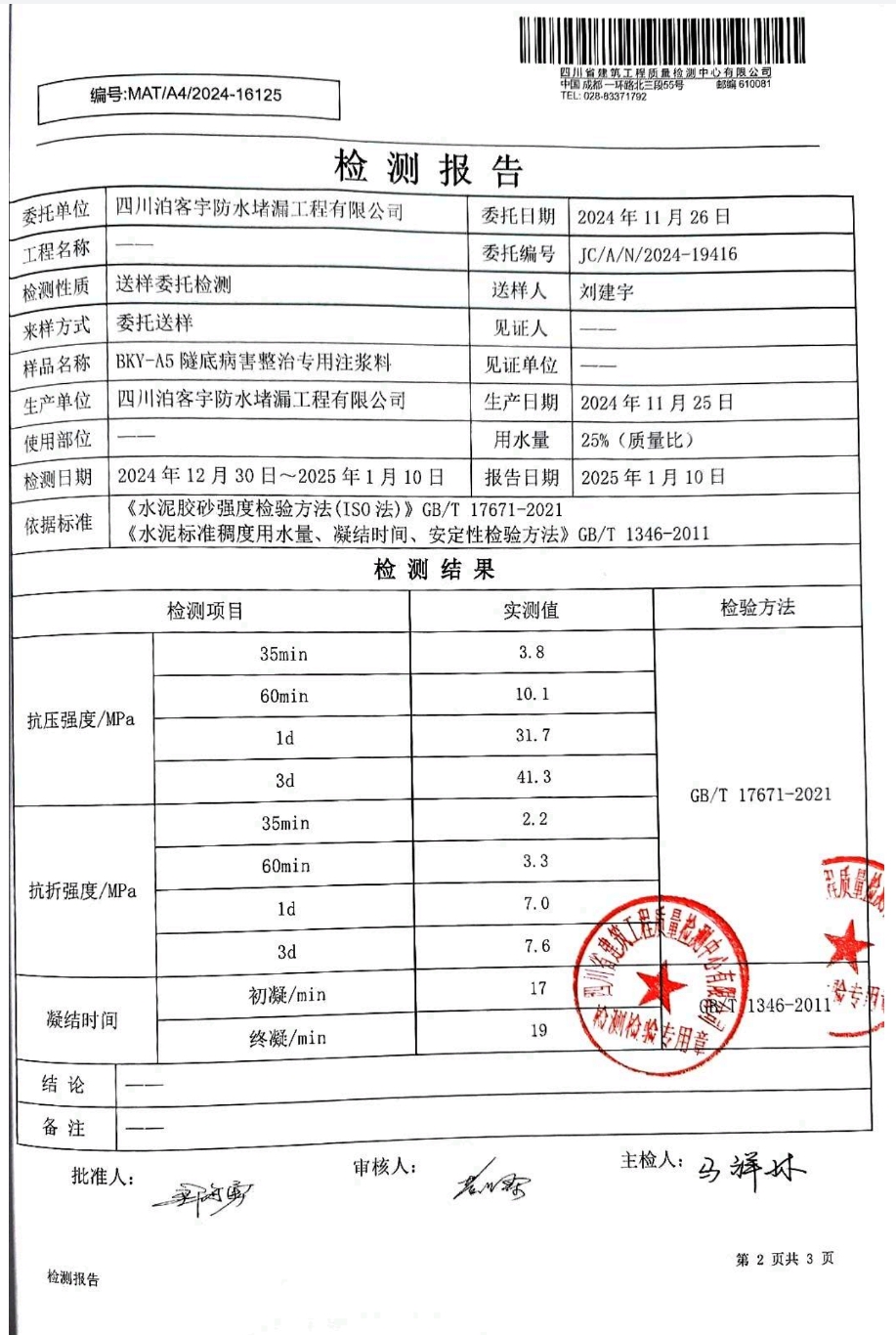 性能:富水环境下,不亲水,可防水。固结后有加固结构裂缝、裂隙、孔洞等性能,从而达到阻水作用。与岩石、砼结构结合性良好。